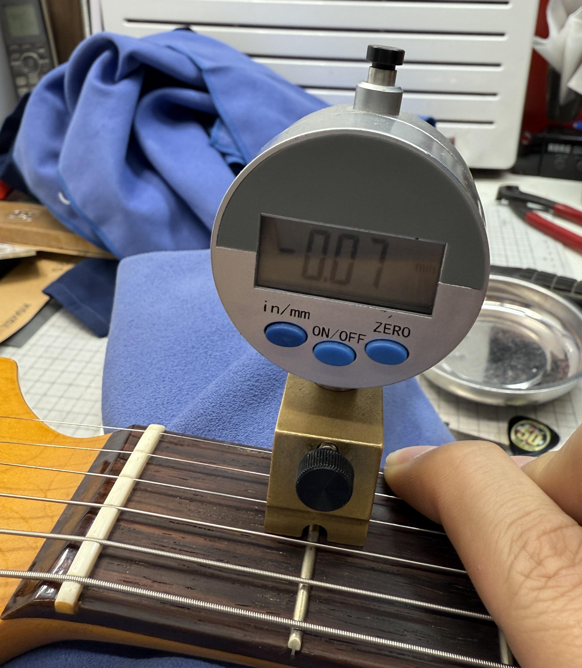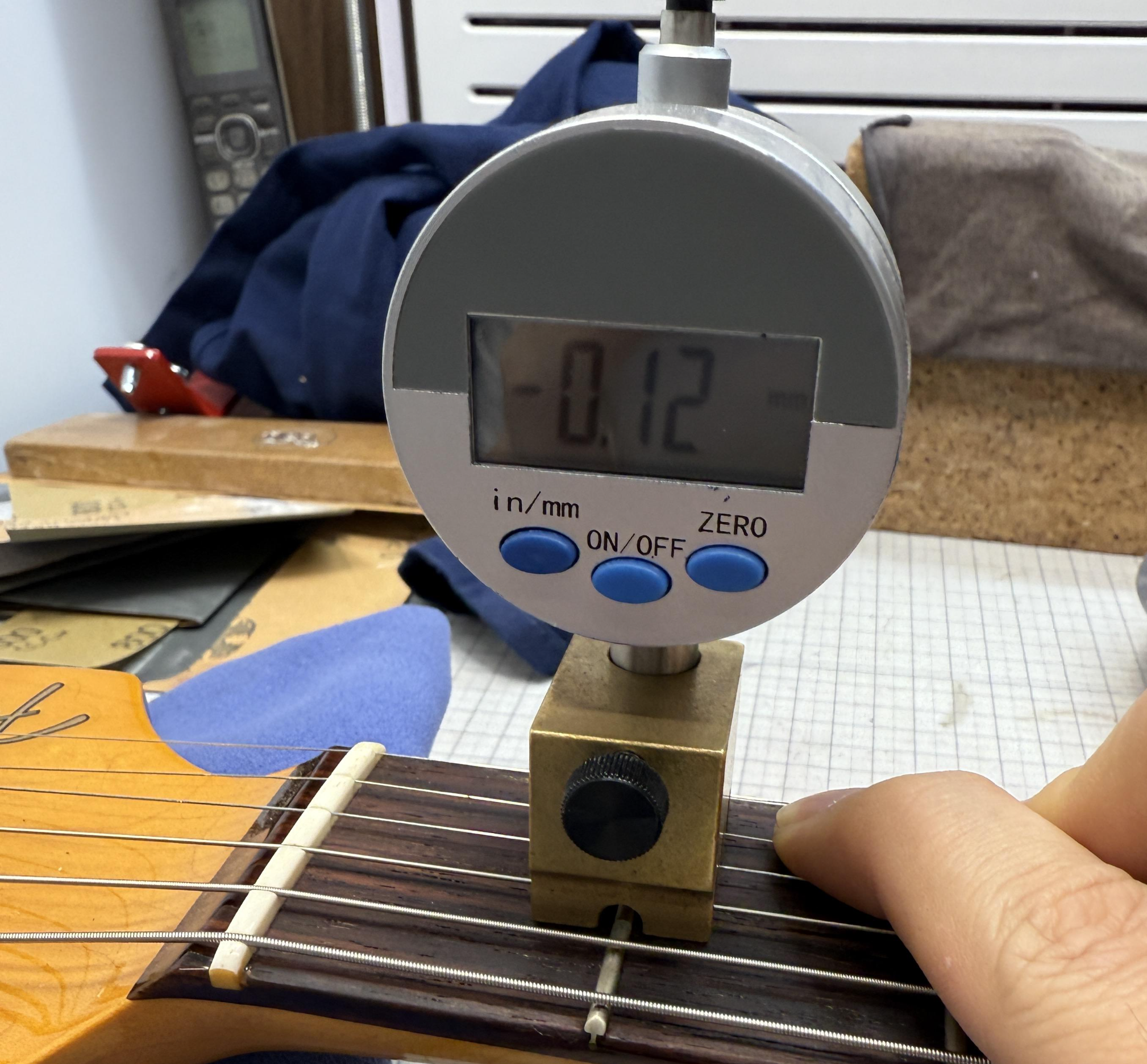 현재 약간의 up bow 릴리프와 하이프렛 레벨링 문제도 있기 때문에 0.02 미리 높게 세팅하였다. 후기로는 엄청 편해져서 만족 중이다. 최종세팅 6번 슬롯부터 0.12, 0.11, 0.10, 0.09, 0.08, 0.07